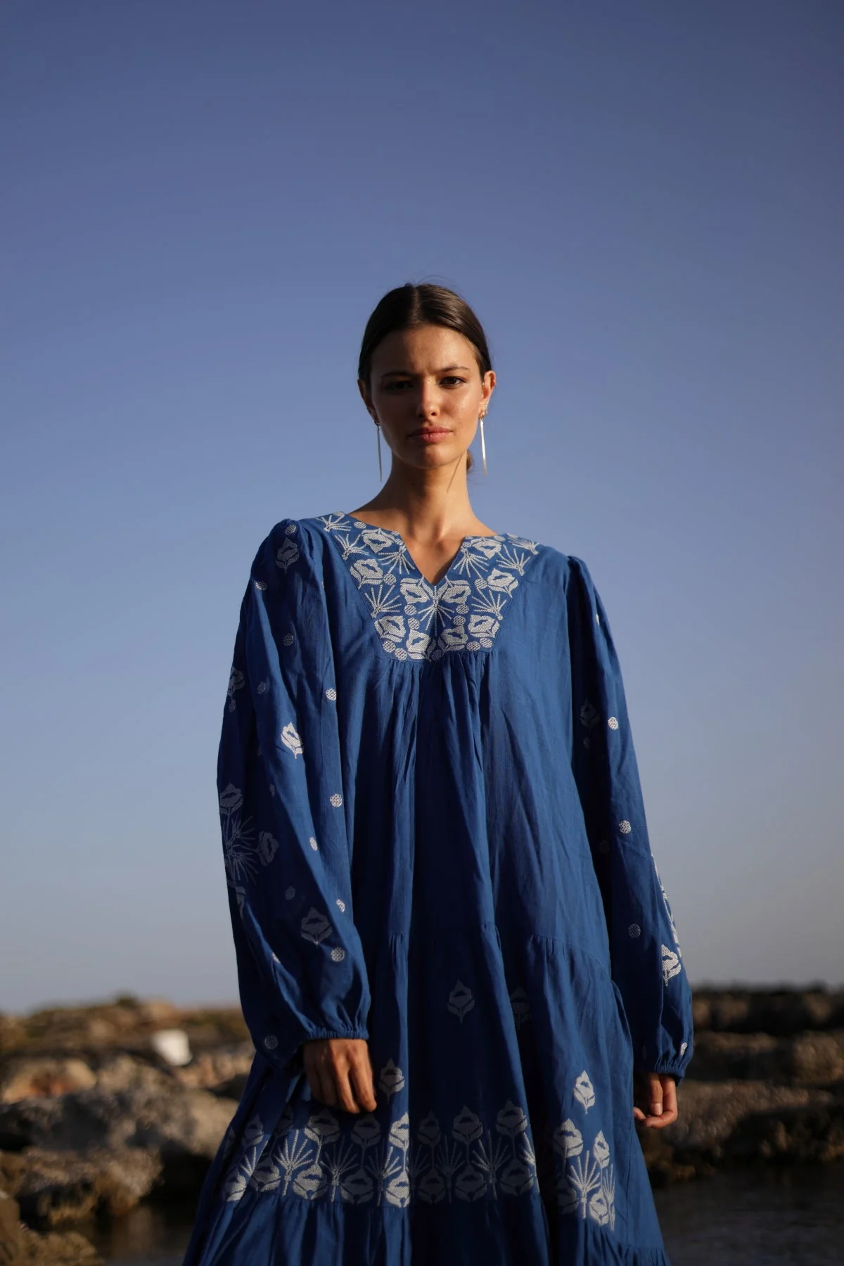 El vestido Pentesilea es super elegante. Su color azul evoca el mar Mediterráneo . Destaca por sus bordados a contraste en color blanco que aportan un toque distinguido y elegante. Su escote en V y las mangas amplias abullonadas fruncidas en puños le añaden un toque de sofisticación. Su falda de corte midi con caída suelta combina comodidad y estilo. El vestido Pentesilea es ideal para un look bohemio y elegante, perfecto para eventos especiales.