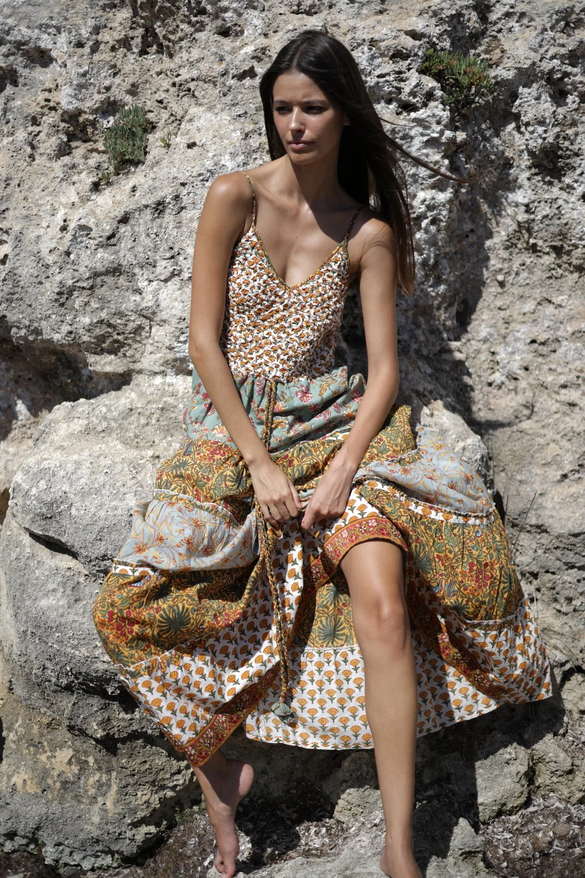 El vestido Salamina es de inspiración boho romántica. Muy femenino. Estampado combinado en tonos, verde, acqua y ocres. Cuerpo fruncido que se ajusta perfectamente a tu silueta, realzándola. Con tirantes regulables. Detalle de cordón a tono acabados con pompón artesanal. Escote redondo en la parte de delante y cuadrado en la parte posterior. Falda larga con volantes, de caída fluida. Sigue tu talla habitual. Material algodón. ¡El vestido Salamina es súper estiloso y favorecedor!
