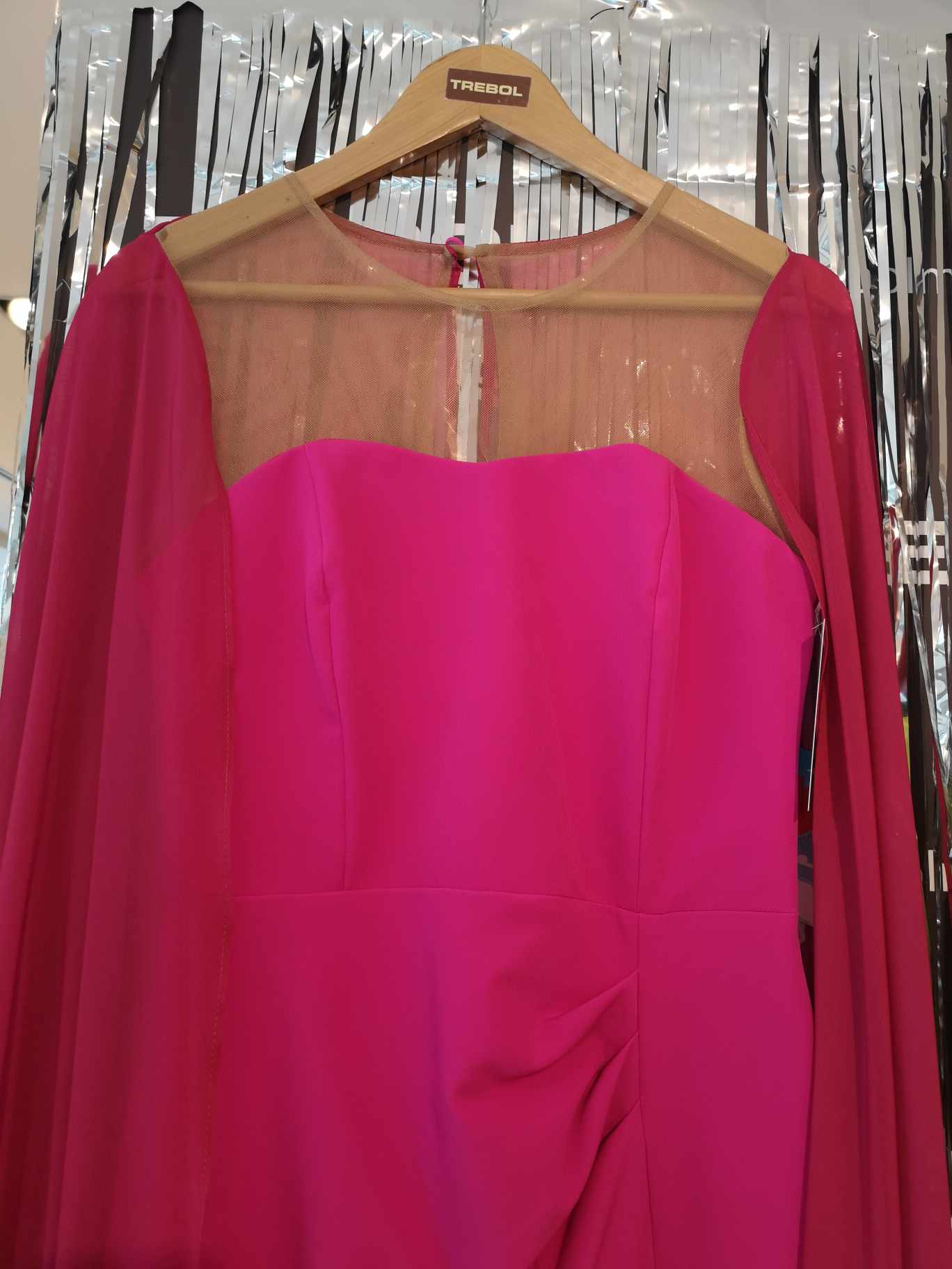 Vestido midi con drapeados en cintura (disimula barriguita), escote delantero con efecto tatoo (transparente de tul), falda midi recta y con gran abertura para estilizar y alargar las piernas.