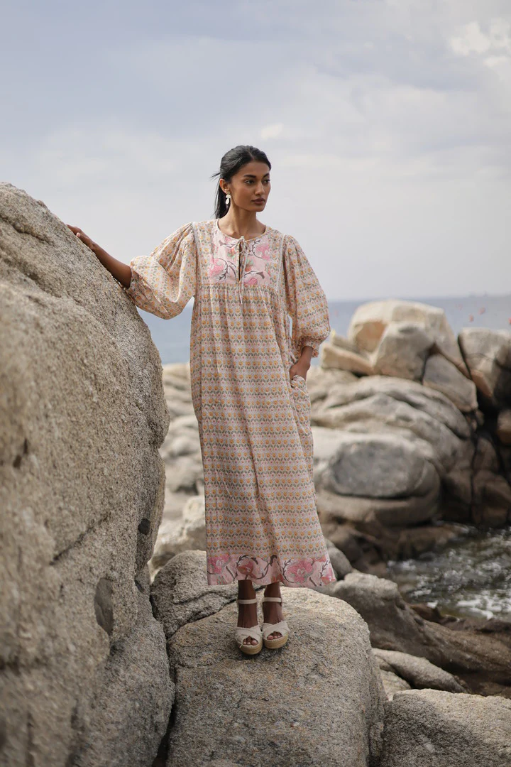 Vestido de algodón Porto Selvaggio. Su delicado estampado perteneciente a la colección Siena,destaca por sus suaves colores amarillo y rosa. Su corte largo tiene una caída fluida. Sin ajustar. Mangas amplias 3/4, abullonadas que le dan un toque romántico y femenino. Escote redondo que puedes anudar con cintas a tono. Con el vestido Porto Selvaggio te verás espectacular!
